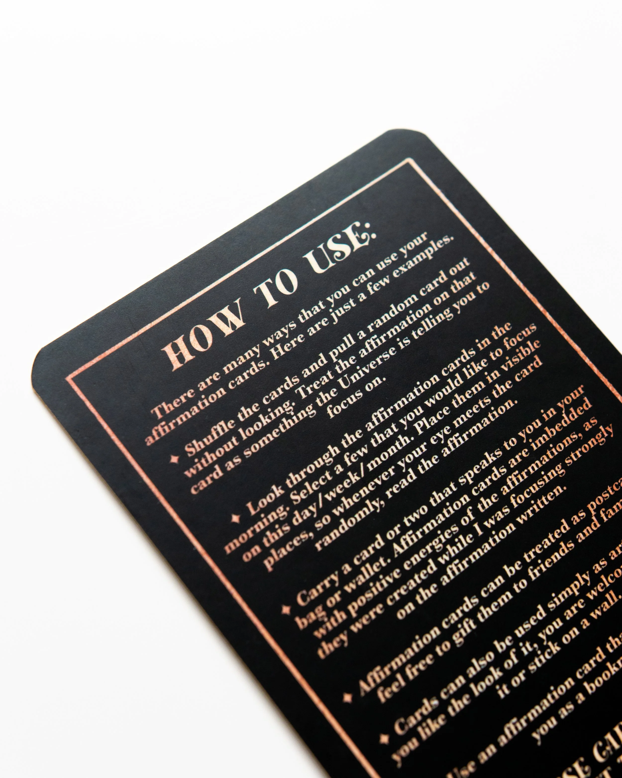 There are many ways that you can use your affirmation cards. These are just a few examples.- Shuffle the cards and pull a random card out without looking. Treat the affirmation on that card as something the Universe is telling you to focus on.- Look through the affirmation cards in the morning. Select a few that you would like to focus on this day/week/month. Place them in visible places, so whenever your eye meets the card randomly, you read the affirmation. - Carry a card or two that speaks to you in your bag or wallet. Affirmation cards are imbedded with positive energies of the affirmations, as they were created while I was focusing strongly on the affirmation written. - Affirmation cards can be treated as postcards - feel free to gift them to friends and family. - Cards can also be used simply as artworks - if you like the look of it, you are welcome to frame it or stick on a wall.For any questions or inquiries please do not hesitate to contact me :)Love, Annie x