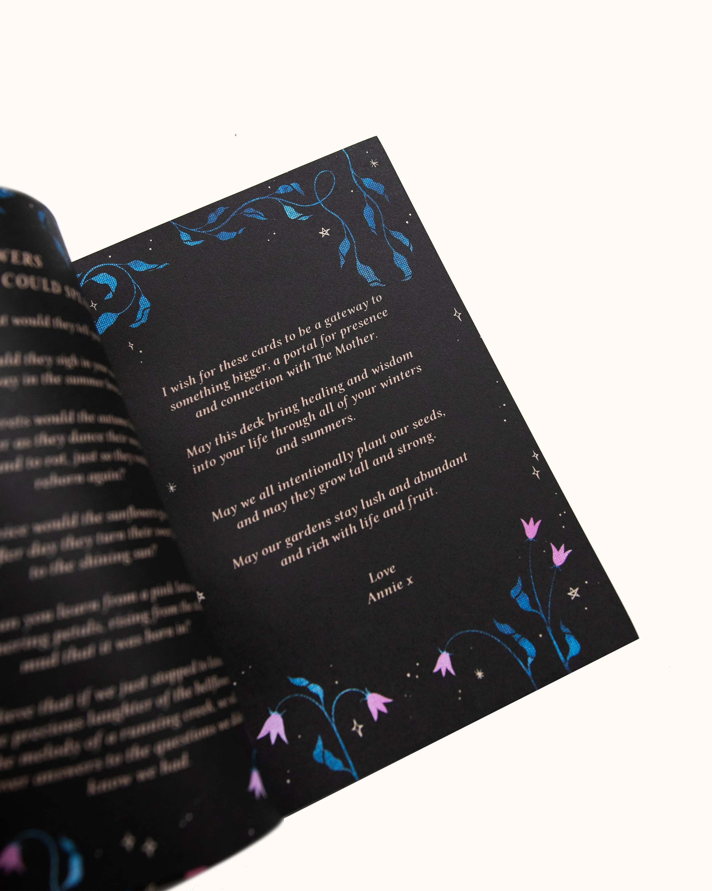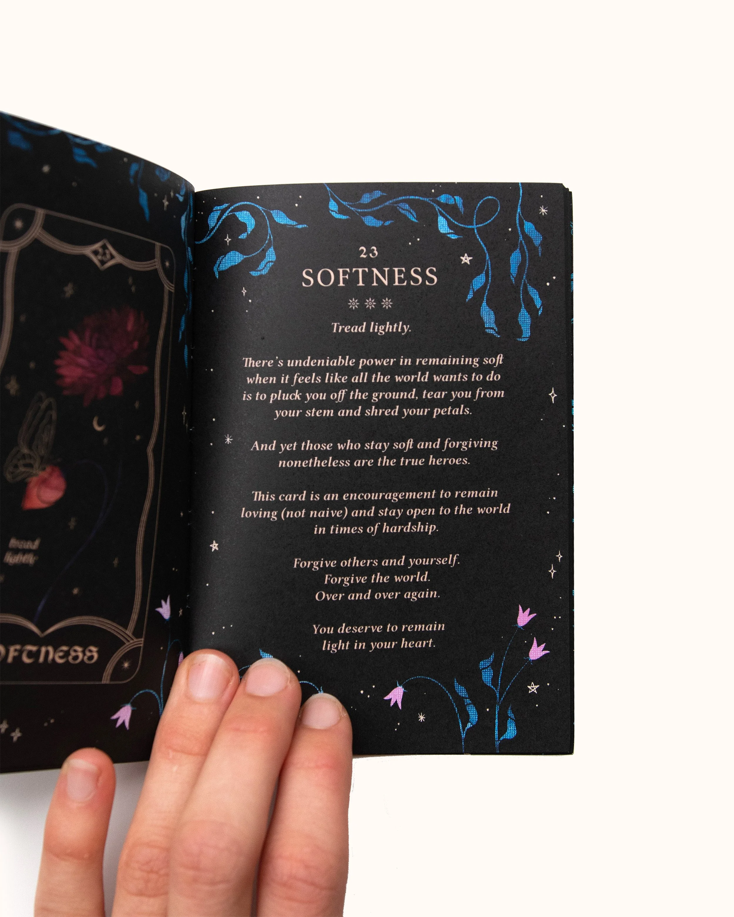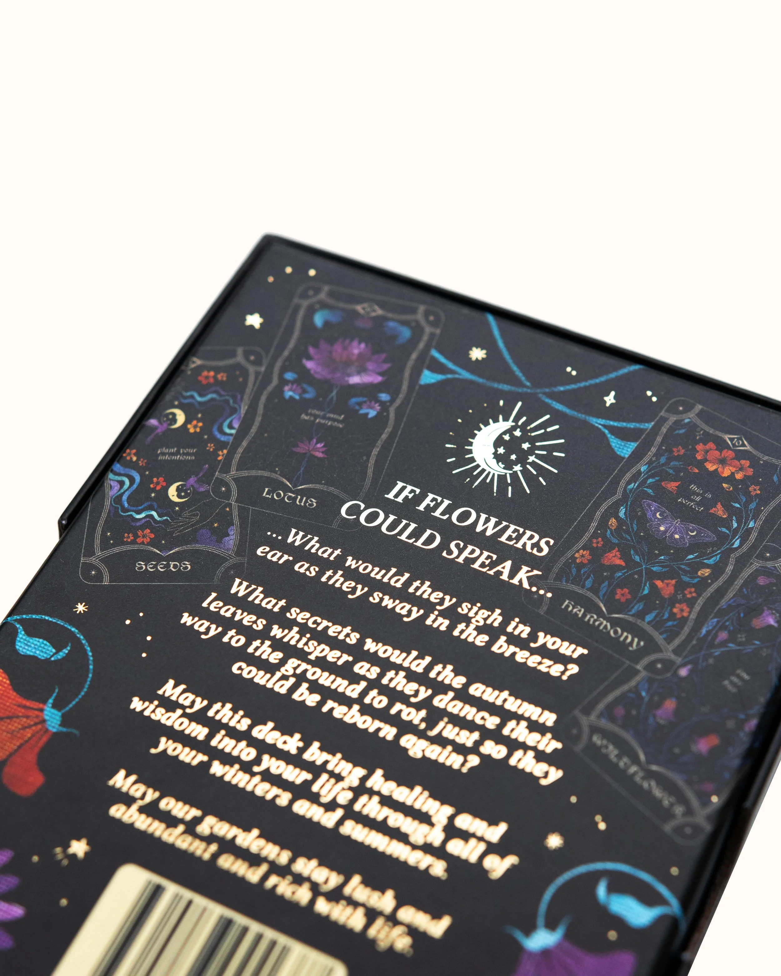 A set of 33 oracle cards + guidebook.Designed and written by Annie Tarasova. If flowers could speak... what would they tell you? What would they whisper in your ear as they sway in the summer breeze? What secrets would the autumn leaves share with you as they dance their way to the ground to rot, just so they could be reborn again? What advice would the sunflowers give you as day after day they turn their sweet faces to the shining sun? What can you learn from a pink lotus with shimmering petals, rising from the sticky mud that it was born in?I believe that if we just stopped to listen to the precious laughter of the bellflowers or the melody of a running creek, we will discover answers to the questions we didn't know we had. Created with love by a self-published, independent artist.❤️