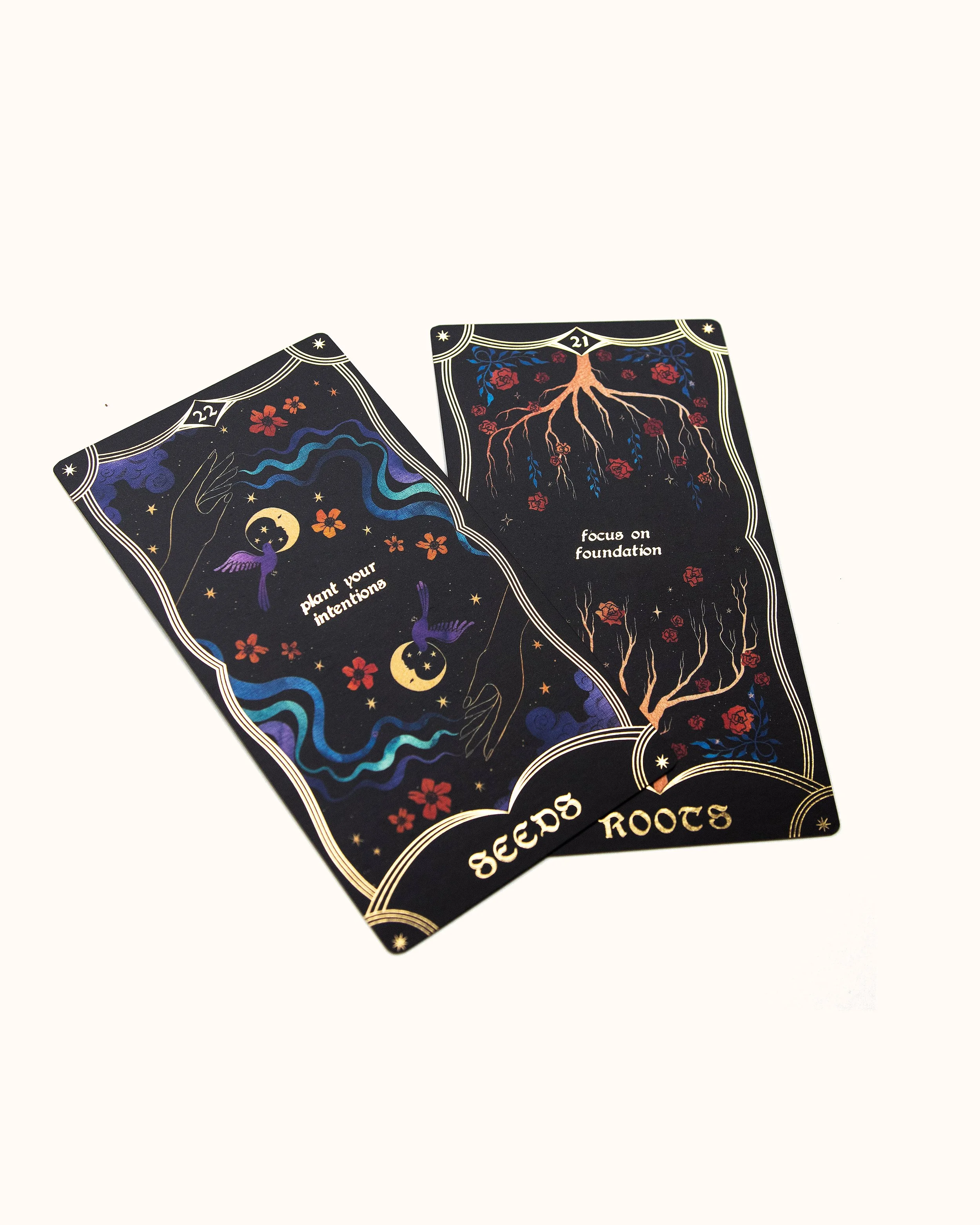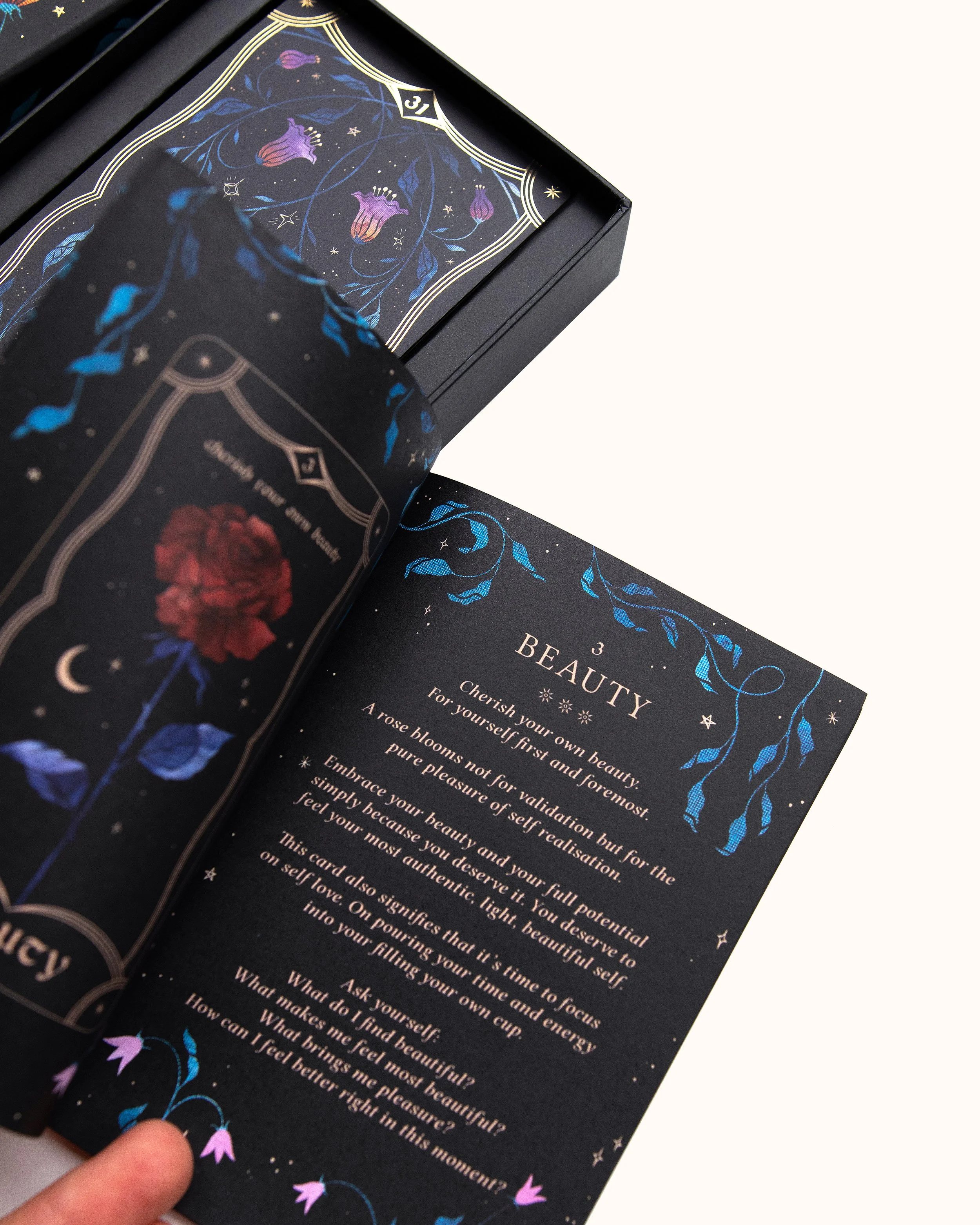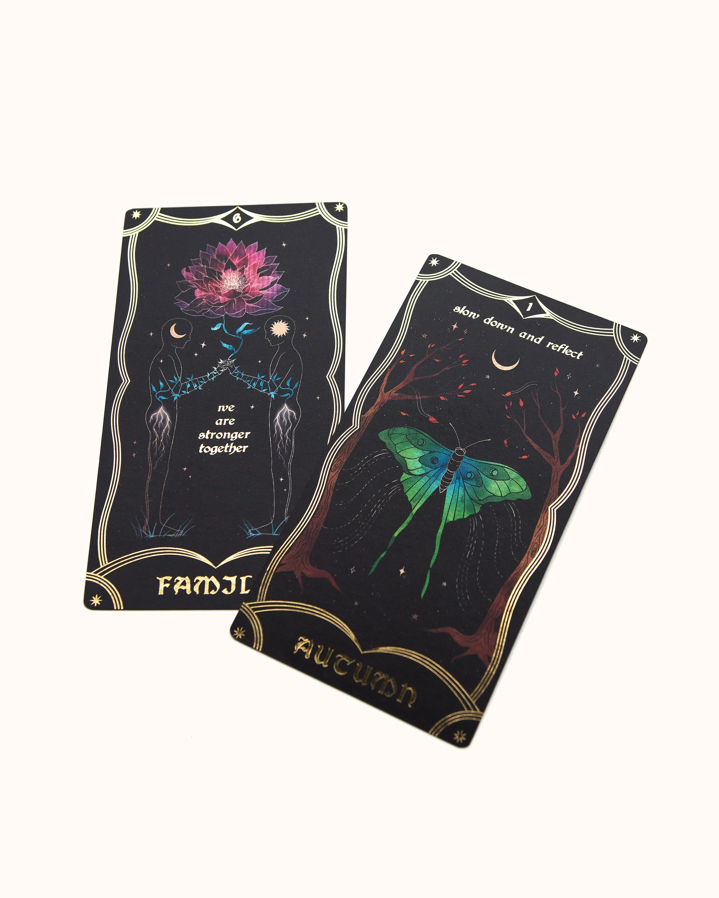 A set of 33 oracle cards + guidebook.Designed and written by Annie Tarasova. If flowers could speak... what would they tell you? What would they whisper in your ear as they sway in the summer breeze? What secrets would the autumn leaves share with you as they dance their way to the ground to rot, just so they could be reborn again? What advice would the sunflowers give you as day after day they turn their sweet faces to the shining sun? What can you learn from a pink lotus with shimmering petals, rising from the sticky mud that it was born in?I believe that if we just stopped to listen to the precious laughter of the bellflowers or the melody of a running creek, we will discover answers to the questions we didn't know we had. Created with love by a self-published, independent artist.❤️