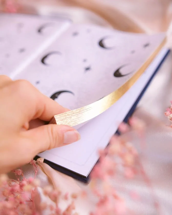 Specifications:Size: A5 (148 × 210 millimeters or 5.83 × 8.27 inches)Cover: cloth with gold foiled artwork.Pages: 180 pages, 120 gsm thickness, with gold foil edges. Think enough to paint your dreams inside.