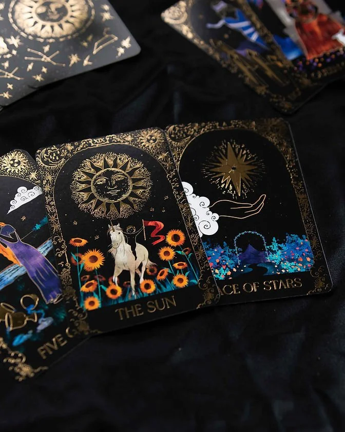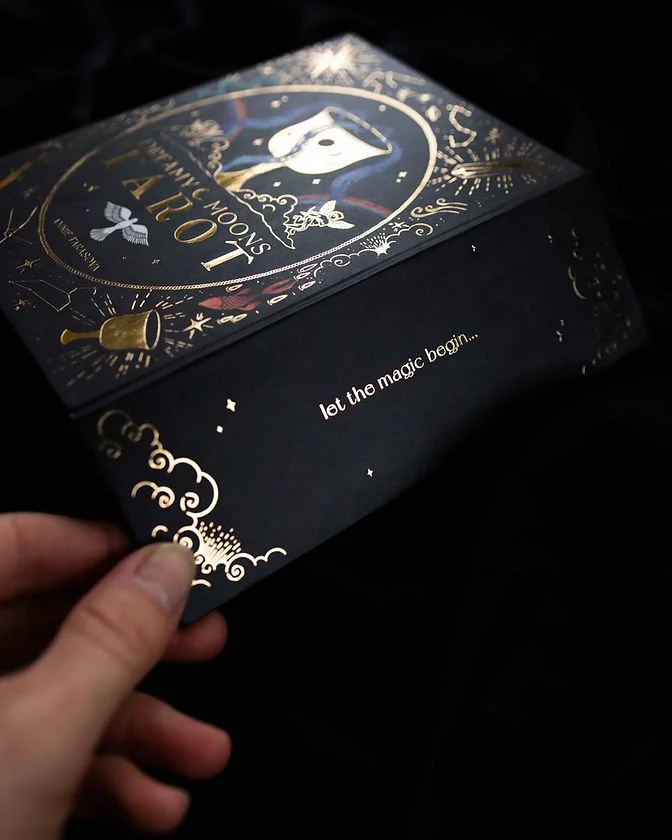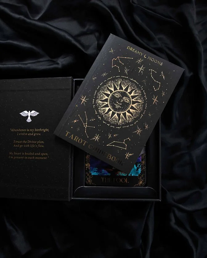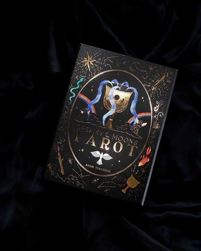 Golden card edges.Dreamy Moons Tarot came from a place of sincere love and divine inspiration. Deeply inspired by Rider-Waite Tarot, Dreamy Moons Tarot contains a lot of traditional symbolism with a celestial twist.Consisting of 80 cards adorned in gold foil, this magical deck features four suits: Cups, Wands, Crystals and Stars; as well as the Major Arcanas. Paired with a 100-page detailed guidebook, this dreamy deck is an invitation to dive into your subconscious, explore your own magic and connect with the Universe that is inside and outside of you.It was an incredibly spiritual, fun and fulfilling journey bringing this deck to life. May it become a significant part of your rituals and bring you wisdom and healing