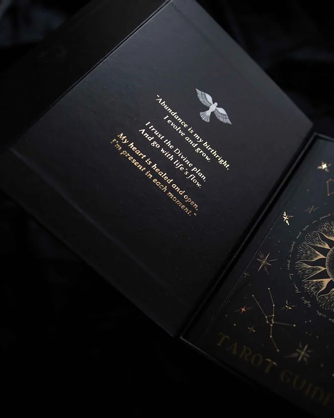 Gold foil detailing on each card, box, booklet.