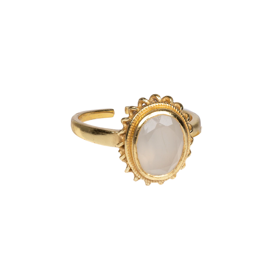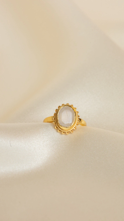 This “Vintage gold'' inspired ring is made of a premium quality and contains of real gemstones. This ring is not only timeless and beautiful, but also tells its own story through those real gems. Material: premium quality 18K gold plating over brass, real White Quartz. - White Quartz: Birthstone of April. The White Quartz stone gives you good energy, power, stability, better concentration, hope and courage. White Quartz increases confidence and improves public speaking skills. It’s a gemstone that contains the energy of light. It will help you to generate a chain of happiness. This stone releases emotions and safely reduces the negative energy and stress from the body.*Gemstones are a product of nature and therefore unique, so the colour of the stone can differ a little from the pictures. Measurements: size adjustable, gemstone: 10 x 10 mmHandmade in India