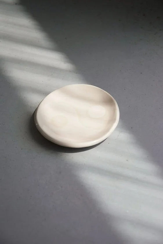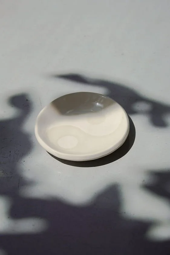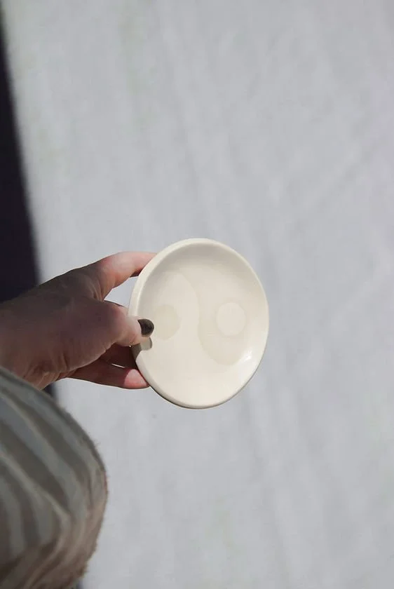 Handmade yin yang plate. This plate is made from a beige stoneware clay, decorated with a beautiful opaque white glaze. The plate is entirely made by hand so each plate is unique and can vary slightly from the one on the photo.